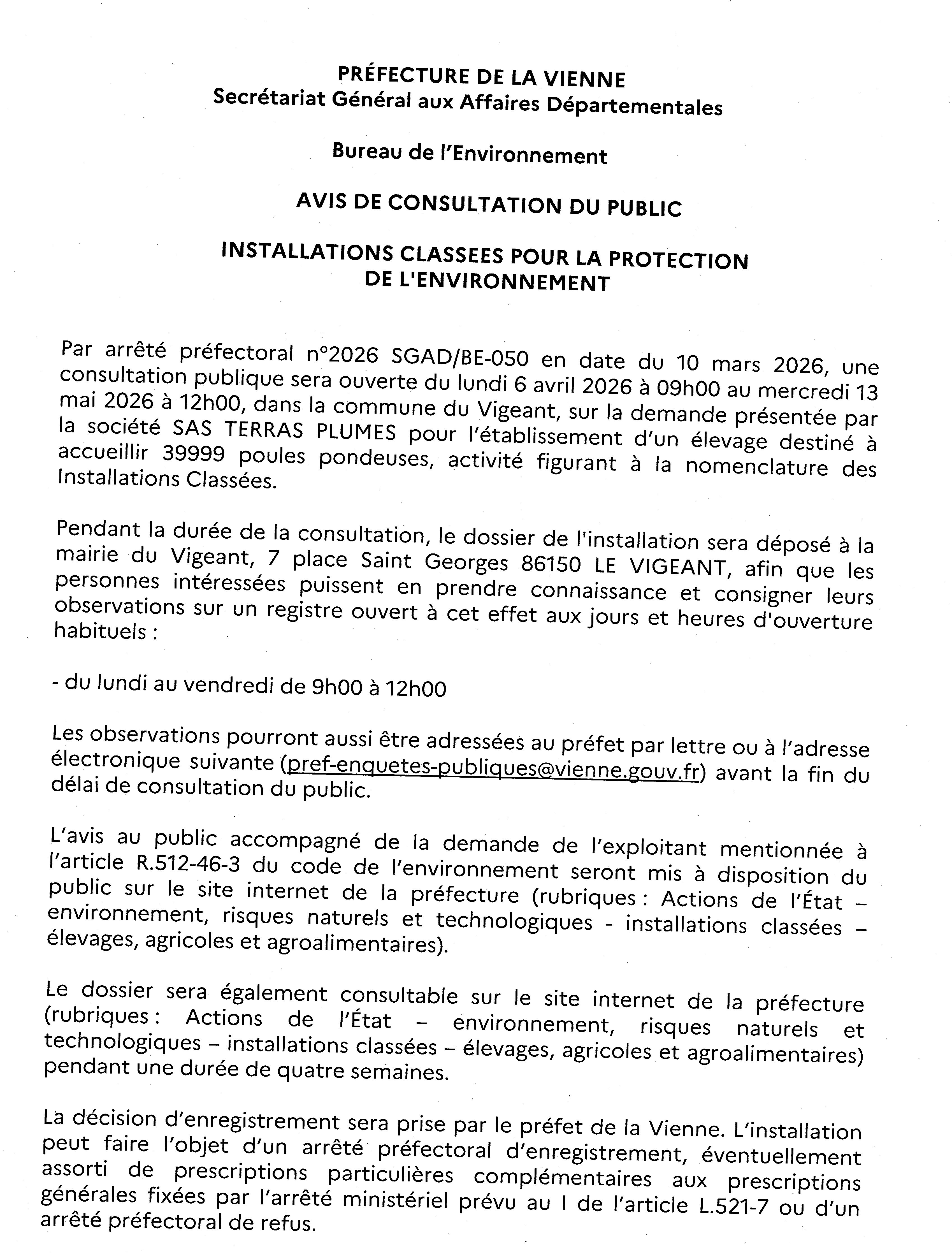 Avis d'enquête publique concernant l'élevage de poules pondeuses de la société SAS Terra Plumes du 6 avril au 13 mai 2026.